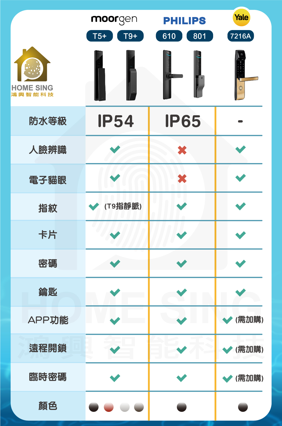 moorgen T5+ / T9+、Philips 801 / 610、Yale 7216A,並分析它們在防水與功能上的差異,幫助你挑選最適合的電子鎖。