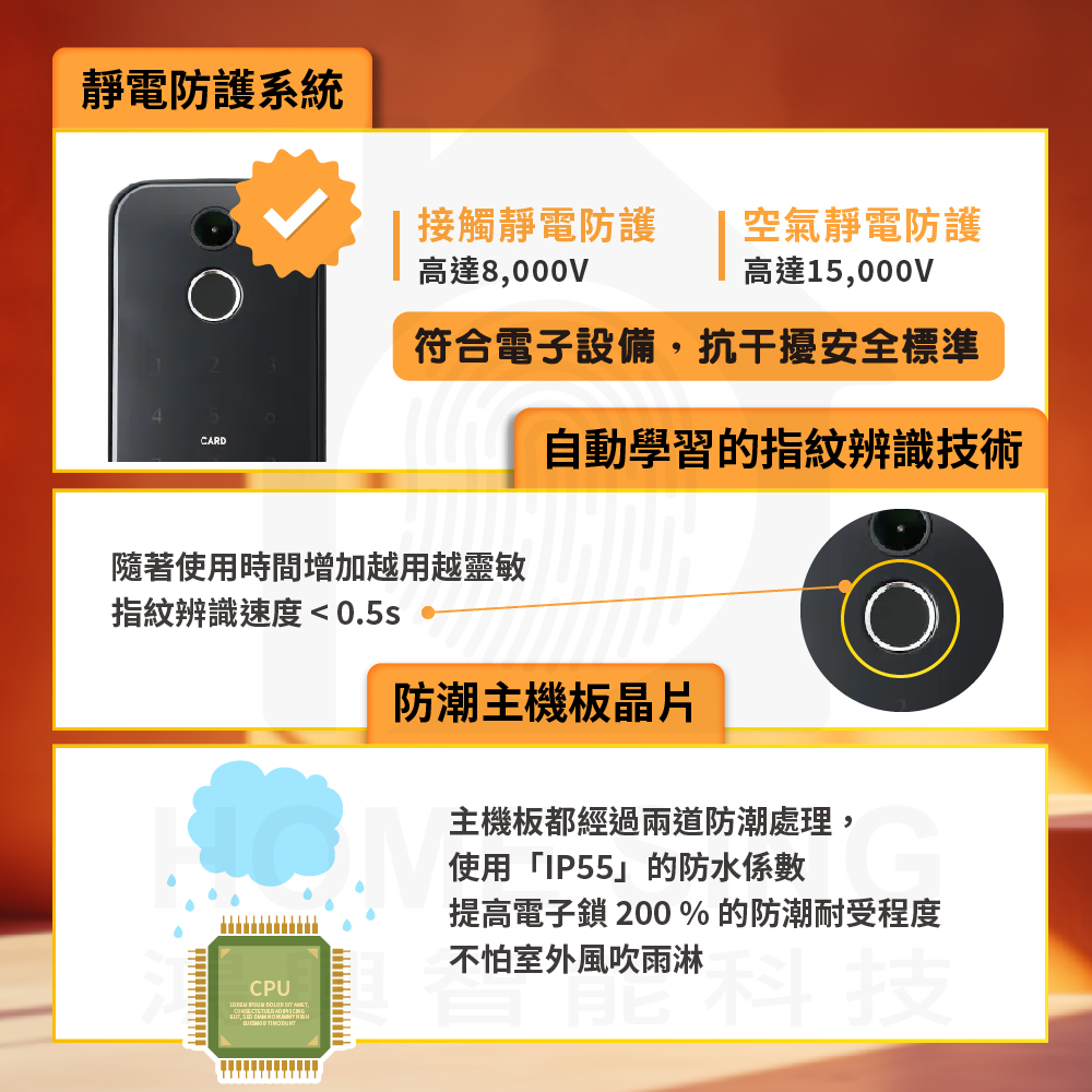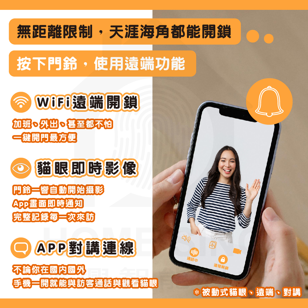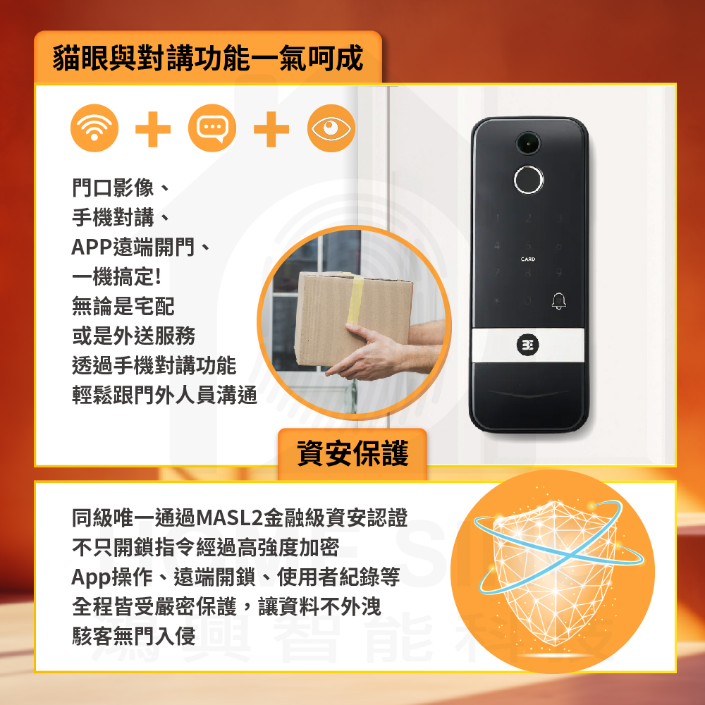 【產品功能】電子貓眼、指紋、卡片、密碼、鑰匙、APP、NFC