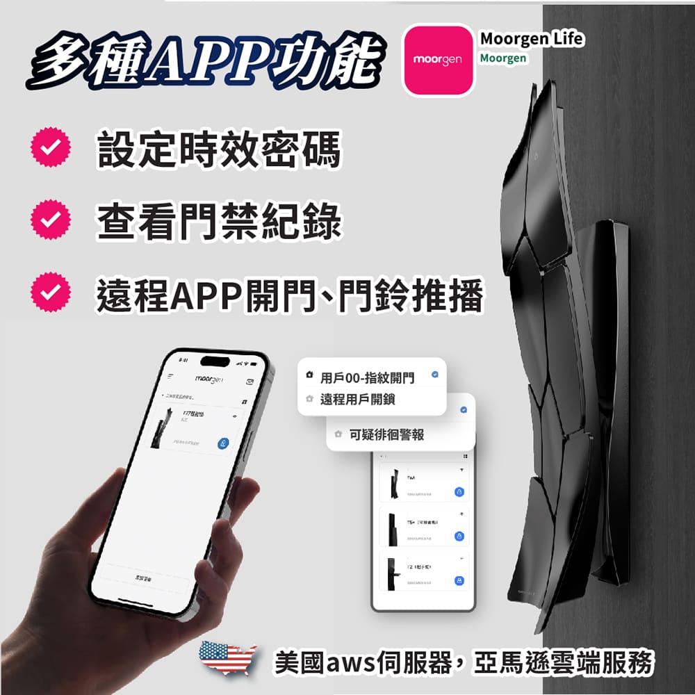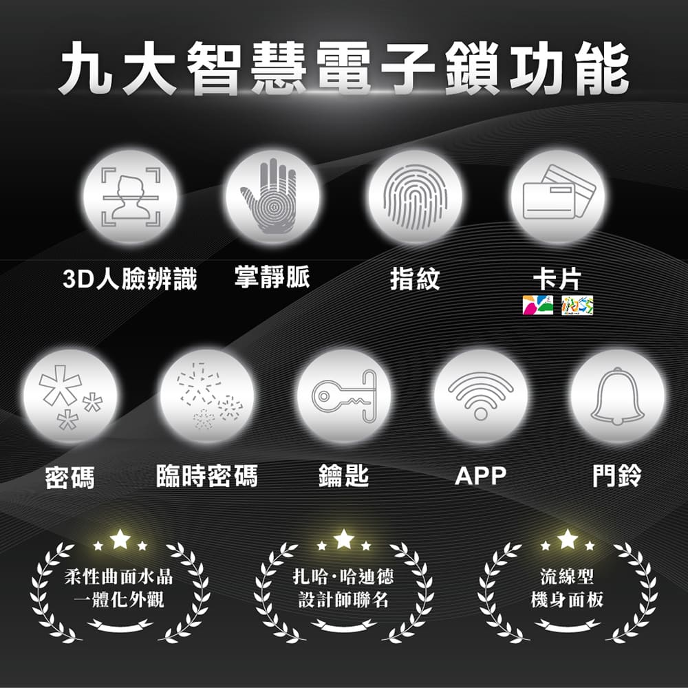 【產品功能】人臉辨識、掌靜脈、指紋、卡片、密碼、鑰匙、遠端APP、門鈴